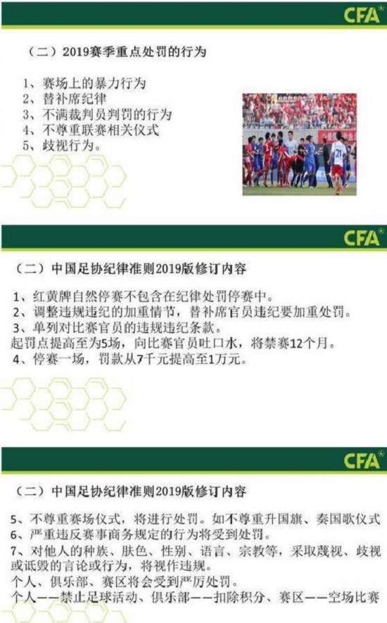 这份关于新赛季赛风赛纪的基本要求延续了2018赛季的高标准,结合FIFA和AFC的相关纪律准则,与中国足球职业联赛的实际情况向结合,对于出现严重违规违纪行为将进行严肃处理。