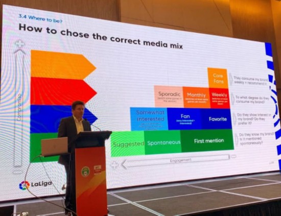 西甲联盟全球品牌总监恩里克莫雷诺在会上讲述了西甲联盟的品牌理念及其重要性。与此同时,莫雷诺对西甲联盟的品牌设计及定位等多方面细节进行了详细的阐述。此外,莫雷诺还从地理位置、受众和商业竞争的角度介绍了西甲品牌在全球不同国家实施的不同战略。