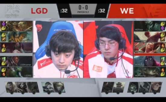 前期,双方打野都是上半野区开局。4分钟,奥拉夫gank下路,只是逼出塔姆的一个虚弱。随后,双方都表现得十分谨慎,并没有爆发团战,产生人头。10分钟,LGD终于在下路找到机会,五人集合包夹下路,直接越塔成功击杀WE三人,阿卡丽强势拿下三杀。