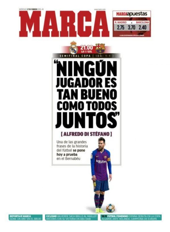 加泰媒体期待梅西的个人英雄主义,皇马喉舌《马卡报》则在头版头条上做出了还击。《马卡报》今天的封面,是梅西照片后的一句名言。“任何个人都无法战胜一个球队。”这是皇马传奇迪斯蒂法诺最著名的言论之一。“现在,到了验证迪斯蒂法诺名言正确性的时候了。”《马卡报》这样评述道。