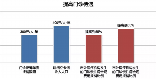 门诊统筹年度报销限额调整到300元/人·年,其中建档立卡低收入人口提高到400元/人·年。在市外医疗机构发生的门诊慢性病合规费用报销比例提高到55%,门诊特殊病合规费用报销比例提高到65%,年度报销限额不变。
