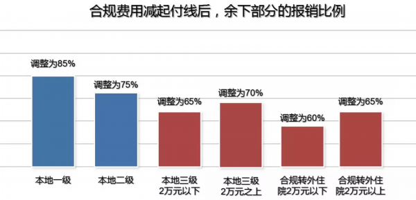 合规费用减起付线后,余下部分的报销比例本地一级医疗机构调整为85%;本地二级医疗机构调整为75%;本地三级医疗机构2万元以下部分调整为65%,2万元之上部分调整为70%;合规转外住院2万元以下部分调整为60%,2万元之上部分调整为65%;