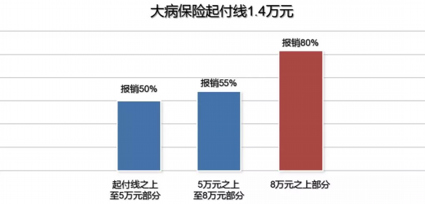 大病保险起付线1.4万元,起付线之上至5万元部分,报销50%;5万元之上至8万元部分,报销55%;8万元之上部分,报销80%。