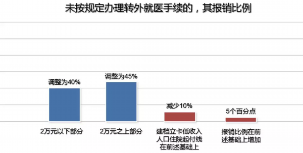 未按规定办理转外就医手续的,其报销比例2万元以下部分调整为40%,2万元之上部分调整为45%。建档立卡低收入人口住院起付线在前述基础上减少10%,报销比例在前述基础上增加5个百分点。