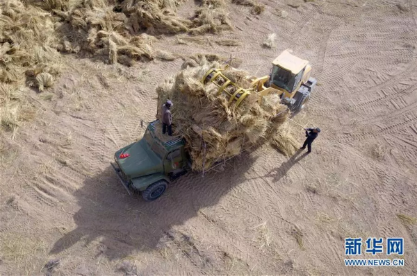 在甘肃省古浪县境内的黑岗沙风沙口,八步沙第二代治沙人郭万刚(右)指挥装载机往车辆上装载压沙稻草(3月26日无人机拍摄)。新华社记者范培珅 摄