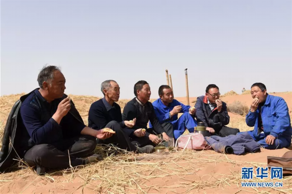 在甘肃省古浪县境内的黑岗沙风沙口,八步沙第二代治沙人贺中强(左一)、郭万刚(左二)、石银山(左三)、罗兴全(右三)、程生学(右二)、王志鹏(右一)在休息间隙吃午饭(3月26日摄)。 新华社记者范培珅 摄