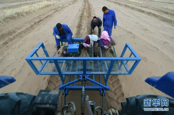 在甘肃省古浪县黄花滩移民区,八步沙第二代治沙人和村民一起使用梭梭肉苁蓉种植一体机种植梭梭嫁接肉苁蓉(3月26日摄)。 新华社记者范培珅 摄