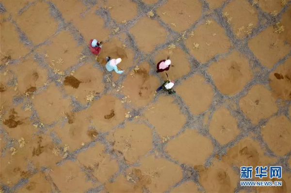 在甘肃省古浪县境内的黑岗沙风沙口,八步沙第二代治沙人在沙漠中压沙治沙(3月26日无人机拍摄)。新华社记者范培珅 摄
