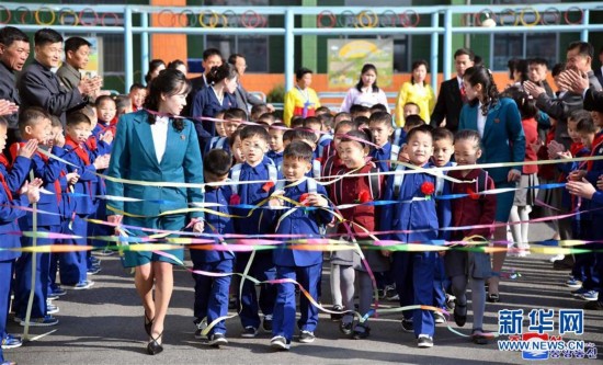 朝中社4月1日提供的照片显示,学生们参加开学典礼。据朝中社报道,朝鲜2019年新学年于4月1日开始,全国各地举行开学典礼。