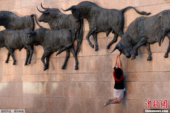 资料图:西班牙马德里,游客在斗牛场雕像下拍照留念。