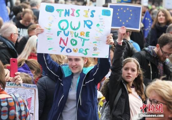 3月23日,在欧盟同意英国延迟脱欧、英国脱欧前景仍面临“灾难的不确定性”困境之际,伦敦市中心举行了大规模呼吁举行“第二次脱欧公投”的示威游行。名为“交给人民”的组织者声称,参加示威游行的英国民众来自全国各地,超过一百万人。图为高举标语的少女。中新社记者 张平 摄
