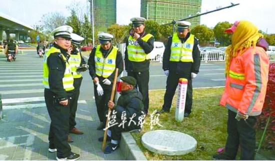 3日上午,盐都区交警大队新区中队队员在世纪大道与西环路岗执勤早高峰时,发现一位老人在马路上徘徊,询问得知老人迷路了。