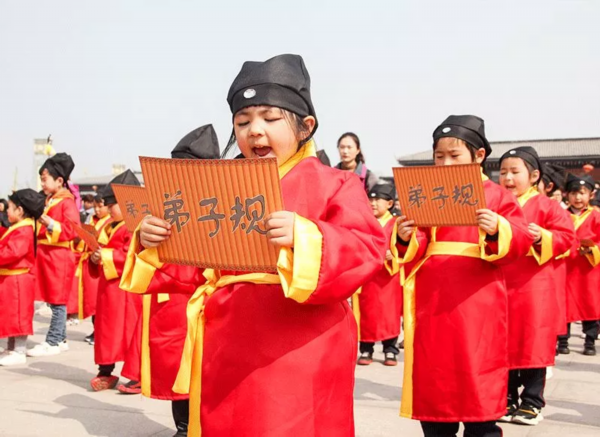 孩子们在老师的带领下, 高声诵读《弟子规》,学习做人的规则,从小做一个知书懂礼的人。