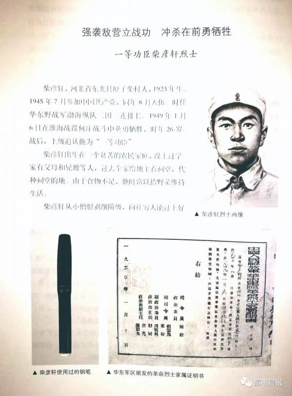 据介绍,柴彦轩烈士,是河北省东光县厦子柴村人,1923年出生在一个贫苦的农民家庭,没上过学,从小向往穷人能过上好日子。参军前就参加了民兵,曾多次与日本鬼子、特务进行斗争,参加破坏敌人铁路等抗日活动。