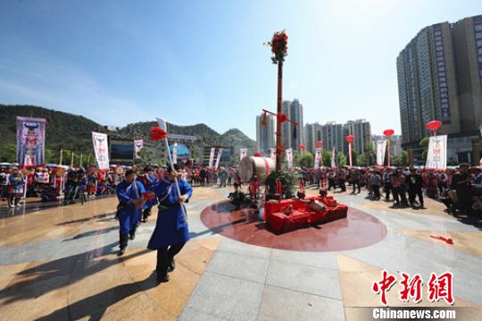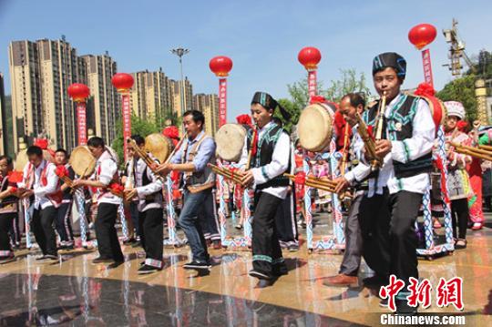 中新网宜宾4月7日电 (王哲 梁俊 申勇)芦笙悠扬乐花山,苗乡风情醉八方。7日,2019中国·四川兴文苗族花山节在四川最大的苗族聚居县—兴文县热闹举行。来自四川、贵州、重庆等地的苗族同胞与当地各族同胞一起祭花杆、跳苗舞,欢度苗族花山节。