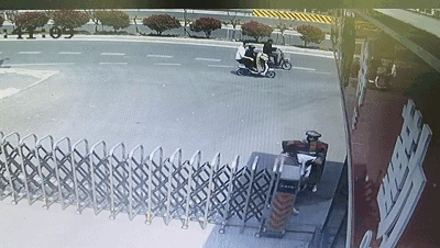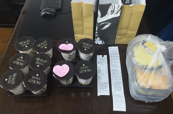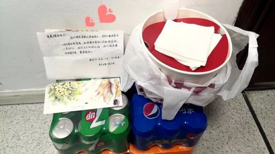 驾驶员将几箱牛奶和饮料放在岗亭旁