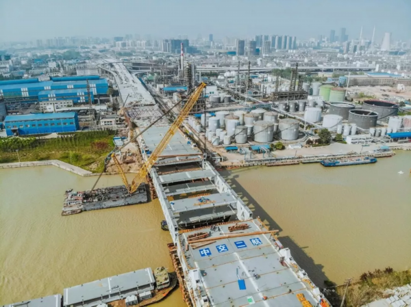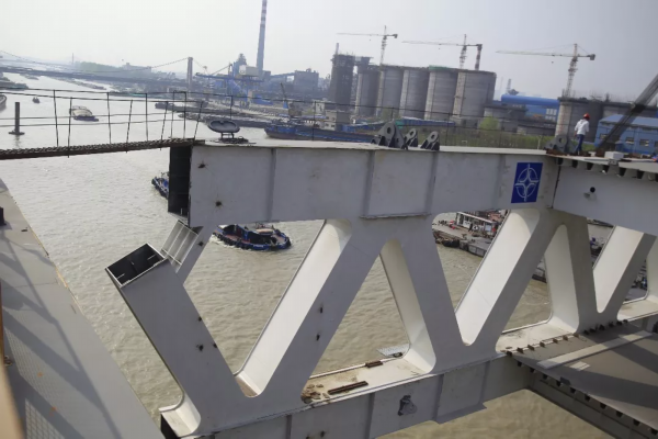 据了解,本次合龙的每块钢桁架长4.5米,重26吨,共8个合龙点,用1台600吨浮吊依次进行吊装。