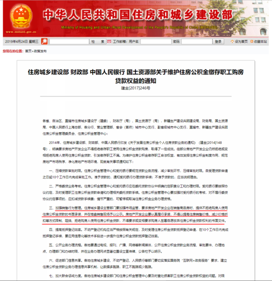记者调查发现,早在2017年12月13日,国家住房城乡建设部、财政部、中国人民银行、国土资源部就下发了《关于维护住房公积金缴存职工购房贷款权益的通知》(建金[2017]246号)的通知,其中第三条明确规定:
