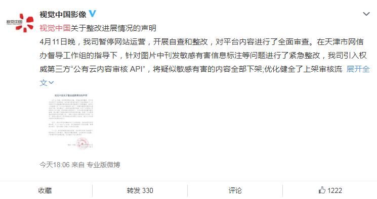 荔枝新闻讯 4月26日,视觉中国官方微博发布了一则关于整改进展情况的声明。声明称,已对针对图片中刊发敏感有害信息标注等问题进行了紧急整改;疑似敏感有害的内容全部下架。