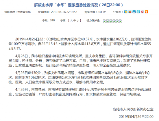 通报指出,4月26日,安陆市组织邀请中科院水环境研究所、重庆水务集团、省环保科学研究院相关专家开展会商,经检测、分析,研究确定了治理方案。目前,安陆市已按照专家意见,采取了紧急处理措施,出水质量明显好转。预计经过26日晚的持续深度处理,27日将全面恢复正常供水。