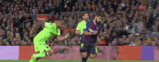 3分钟后,梅西斜传,登贝莱兜射远角偏出,苏亚雷斯不满队友不传球。