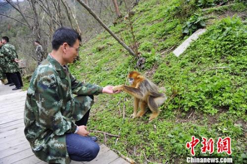 图为金丝猴与参观者互动。中新社记者 王晓晖 摄