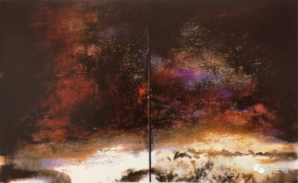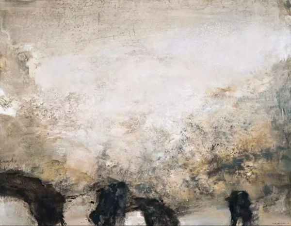 1974 年,赵无极开始同时用水墨和油画两种材质创作同一构图的作品,灵韵逐渐溶进云彩或水气中。