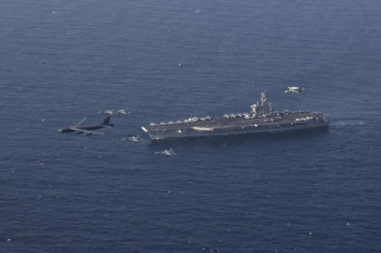 美国空军在一份声明中强调,此次演习是一次复杂的“联合模拟打击行动”。航母战斗群在演练中出动了MH-60直升机、F/A-18舰载战斗机、电子战飞机以及舰载固定翼预警机,掩护B-52轰炸机,进行了一次模拟防区外打击。