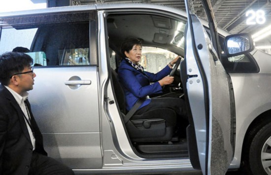 日本东京都知事小池百合子试乘装有安全装置的汽车。(图片来源:日本《朝日新闻》网站)