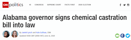 当地时间10日,美国阿拉巴马州州长凯·伊维签署一项法案,该项法案强制要求被判犯有“性侵13岁以下儿童”罪的人在出狱前一个月开始服用抑制睾丸激素的药物,即所谓的“化学阉割”。