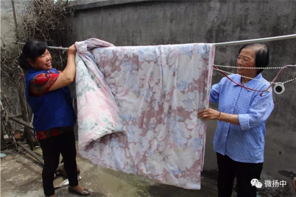 △陈桂英心疼丁荣美一人忙前忙后,也来搭把手,一起晒被子~~