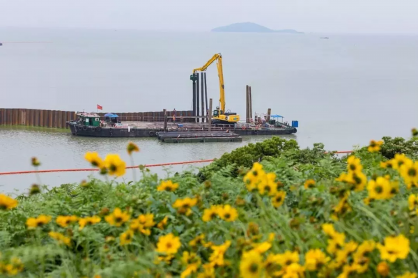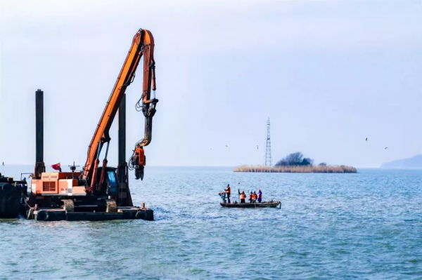 钢板桩围堰向湖中延伸
