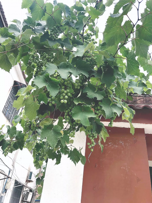 “小杨,你家的葡萄结出来了,快来看看。”6月12日上午,在清江浦区蔬菜社区的一条小巷里,一位奶奶摇着扇子,对着邻居杨先生喊了一声。只见旁边墙头上,绿色的小葡萄粒挂满枝头,仿佛正在向奶奶招手,“再过个把月,我就上你家来摘葡萄。”奶奶开玩笑地说。杨先生则笑着表示欢迎。
