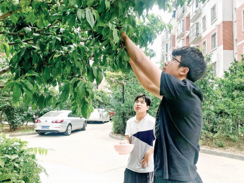 在清江浦区加州城小区D区,早年间参与小区绿化认养的很多居民都在小区里种植了各类果树,如今,这些果树大多进入壮年,枇杷、李子、油桃、山楂、葡萄、无花果……行走在小区,随处可见挂满丰硕果实的枝条。