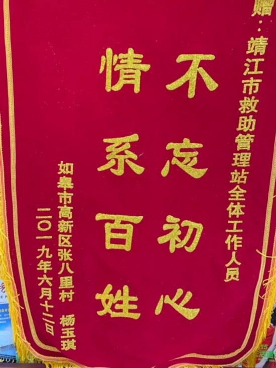 6月12日上午,靖江市救助站收到了如皋高新区一户家庭送去的一面锦旗。