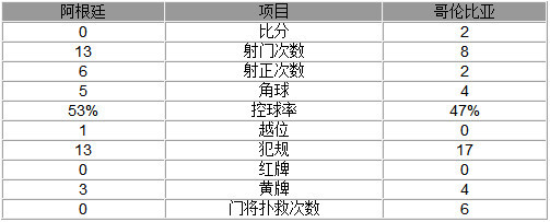 阿根廷全场控球率达到53%,13次射门6次射正,哥伦比亚8次射门2次射正。阿根廷上半场只有1次射门,而哥伦比亚下半场3次射门打入2球。梅西4次射门2次射正,罗杰-马丁内斯2次射门打入1球,萨帕塔唯一一次射门就破门。