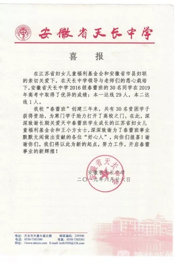 荔枝新闻讯 近日,高中“春蕾班”所在学校安徽省天长中学、江苏省泗阳中学、江苏泗阳致远中学纷纷发来高考喜报,成绩令人振奋。其中安徽天长中学“小方春蕾班”30名高考生29人达一本线,1人达二本线,本科达线率100%,创“春蕾班”高考本科达线率新高;江苏泗阳中学“慈济慈善事业基金会春蕾班”70名学生中,68人参加高考,67人达本科线,本科达线率98.5%;江苏泗阳致远中学“小方春蕾班”30名学生中有28人参加高考,25人达本科线,本科达线率89.3%。