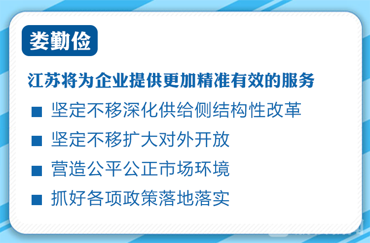 调研期间,娄勤俭与部分企业代表进行座谈,深入了解各产业发展面临的形势、企业生产经营状况以及对相关政策的意见建议等。名硕电脑、盛虹控股集团、希捷国际、捷普电子、鹰普航空等企业负责人参加座谈,大家都对江苏良好的营商环境表示满意,娄勤俭边听边与大家就许多具体问题讨论交流,表示对企业提出的有关建议,省委、省政府将认真研究。娄勤俭指出,发展中出现风险和挑战并不可怕,关键是要坚定信心做好自己的事情,化危为机,发现机遇、抓住机遇、用好机遇,进一步加快发展。娄勤俭强调,企业是我省经济稳定发展、结构转型升级的基础,希望各企业从供应端和需求端双向发力,顺应经济全球化和区域一体化趋势,巩固拓展市场,提升创新能力,加快转型升级,共同推动经济高质量发展。江苏将坚定不移深化供给侧结构性改革,坚定不移扩大对外开放,进一步营造公平公正市场环境,切实抓好各项政策落地落实,为企业提供更加精准有效的服务。