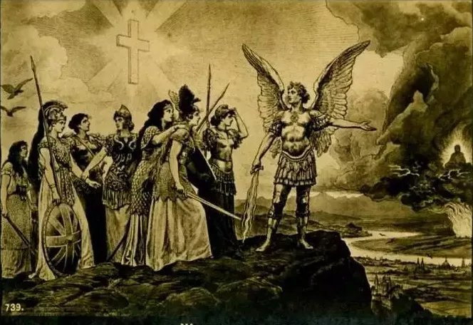 画中七位天使一样的人物分别代表德、英、法、意、奥、俄七个西方国家,她们拿着长矛与盾牌站在一处悬崖上,头顶是一个大十字架的背景,大天使米歇尔站在崖边,大家面前,表情严肃而神圣地说:“欧洲国家联合起来!保卫你们的信仰与你们的家园!”在悬崖深涧、隐约的山河城廓的那一边,半空中悬着一团奇形怪状的乌云,乌云中心闪现着一团火焰中佛陀的坐像,骑在一条中国式的恶龙身上。