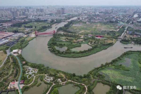 无人机拍摄的扬州三湾运河公园周边的古运河景色(6月17日摄)。新华社记者 季春鹏 摄