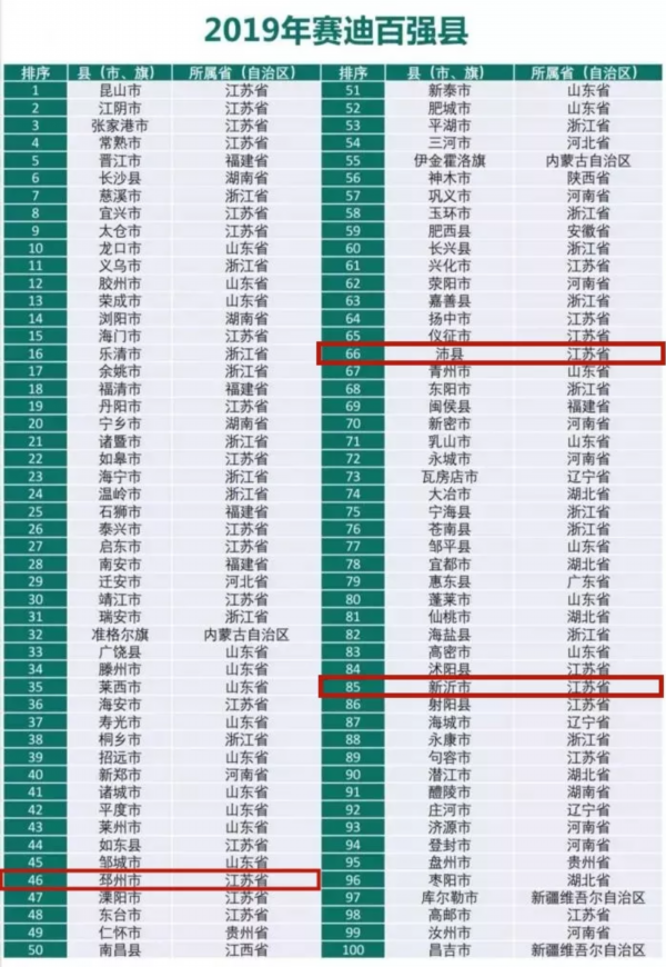 江苏有26个县(市)上榜,占总数超过四分之一。其中徐州的邳州、沛县、新沂三地上榜。