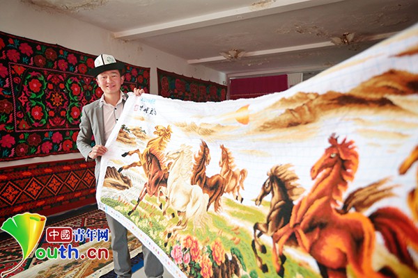 公司的部分绣品。柯尔克孜族的头巾、枕头、被面、马衣以及悬挂的各种布面装饰品上,都绣有各种美丽、精致的花纹,图案有花卉、飞禽、走兽和各种几何图形。色彩鲜艳,形象生动活泼。中国青年网记者杨月 摄