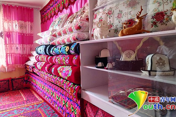 如今,合作社已经吸纳了建档立卡贫困户16人。合作社绣娘古丽沙旦·依力亚孜告诉中国青年网记者,柯尔克孜族姑娘出嫁,以前都是自己家缝制被褥等全套嫁妆,现在很多人都会选择来合作社购买制作精致的刺绣成品,一套嫁妆16条到30条被褥不等,每条刺绣被褥均价在500元左右,订购的越来越多,绣娘们也忙坏了。