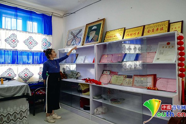 肉孜巴义·木尔达西展示刺绣作品。中国青年网记者 王增强 摄