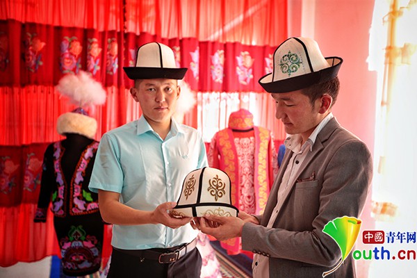 肉孜巴义·木尔达西和斯依木克展示带民族刺绣纹样的毡帽。中国青年网记者王增强 摄