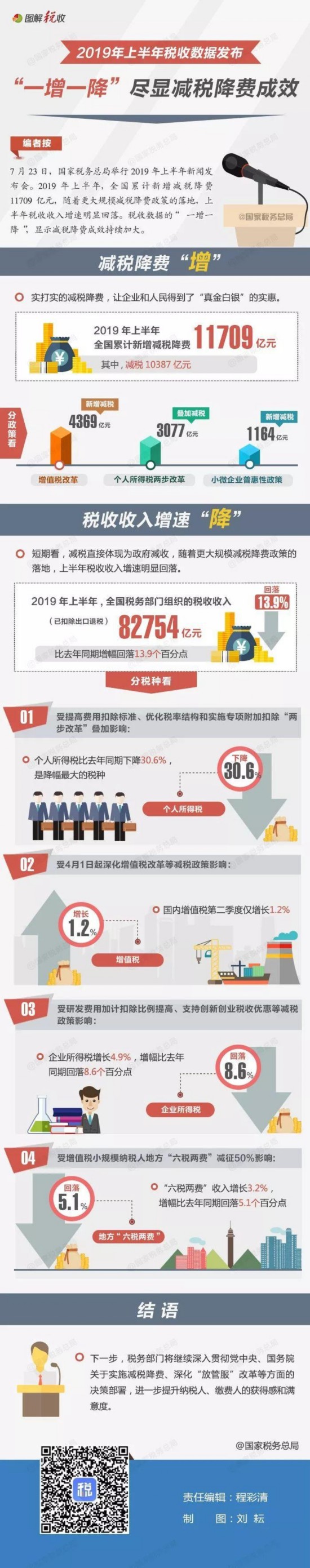 7月23日,国家税务总局召开2019年上半年新闻发布会。数据显示,2019年上半年,全国累计新增减税降费11709亿元,随着更大规模减税降费政策的落地,上半年税收收入增速明显回落。税收数据的“一增一降”,显示减税降费成效持续加大。具体有哪些亮点,戳图了解↓