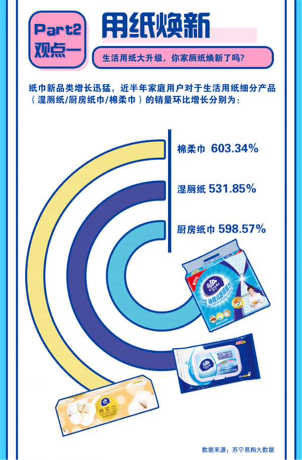 《2019国民家庭好物挑选趋势报告》由维达首次联合苏宁易购推出,聚焦国民家庭好物挑选观念、现状与趋势,反映当今国民家庭挑选好物的焕新局面。报告显示近半年来生活用纸细分产品(湿厕纸、厨房纸巾、棉柔巾)的销量环比增长均超过500%,可见国民家庭正在经历“用纸焕新”。维达品牌一直强调要让产品走到需求前面,未来维达也将推出更多韧性好物,带动消费者主动追求更高品质的生活。