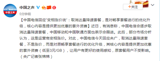 近日,有消息称,中国电信会逐步取消达量降速套餐,中国移动和中国联通方面也表示会跟进。此后,部分市场分析认为,这是运营商变相涨价。对此,中国电信今天回应央广,取消达量降速套餐,不是涨价,而是对原畅享套餐进行的优化升级,其核心内容是提供更加优惠的套外资费(低至3元/GB),让用户有更好的使用感知,原套餐用户不受影响。