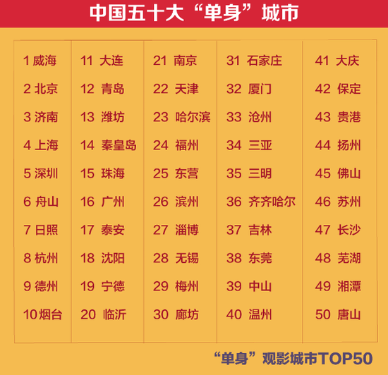 数据显示,“单身”观影率最高的五大行政区域分别是北京、上海、山东、天津、辽宁,这些区域的“单身”观影率均在30%以上;而西北地区“脱单”率最高,达到接近8成,新疆、青海、甘肃、宁夏、内蒙古位列“脱单”率TOP5。而在城市分布上,北京、上海、深圳等一线城市也均在“单身”城市排行中名列前茅。