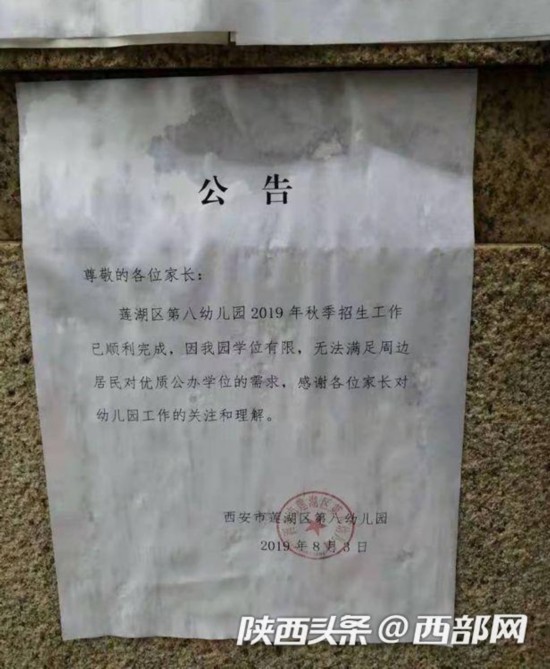 西部网讯 “还没看到招生通知呢,突然就说招生结束了,没招生就满员,这太不符合逻辑。”近日,家住西安市大兴新区永安路附近的张先生向西部网民生热线栏目反映,为了孩子上学,他从去年开始一直关注着莲湖区第八幼儿园的秋季招生动态,可令他没想到的是,8月3日,幼儿园突然贴出告示称,招生已满。“还没招生呢,学生就满了,这也太奇怪了。”